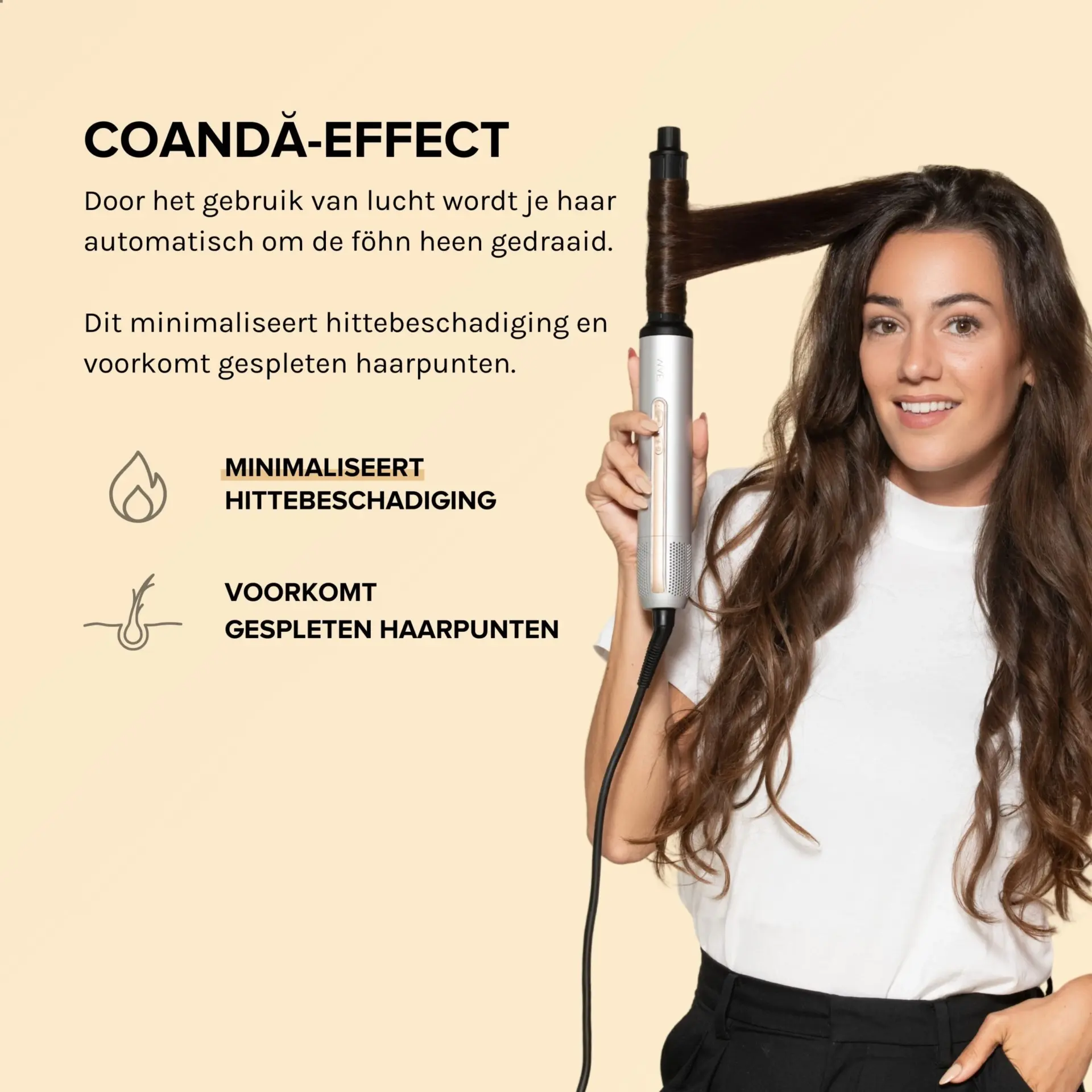 Dankzij de slimme Coandă-technologie wikkelt het haar zich vanzelf om het opzetstuk. Je hoeft alleen maar te sturen, de airstyler doet de rest. Klaar? Met een koude luchtstoot fixeer je het resultaat zodat het extra lang blijft zitten. De airstyler is geschikt voor elk haartype, van steil tot krullend, van fijn tot vol haar.
