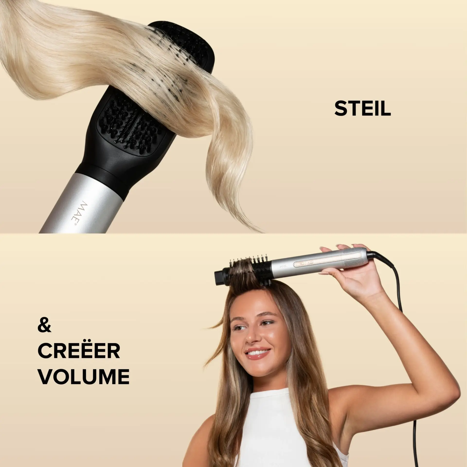 Met de MAE Airstyler II creëer je moeiteloos een frisse look: van glanzende lokken tot luchtige krullen en extra volume. Deze 5-in-1 multistyler föhnt, stylet of krult in één beweging, zonder je haar te beschadigen. Perfect voor wie thuis wil genieten van een salonwaardige styling.